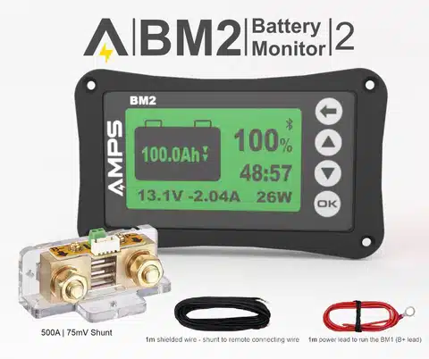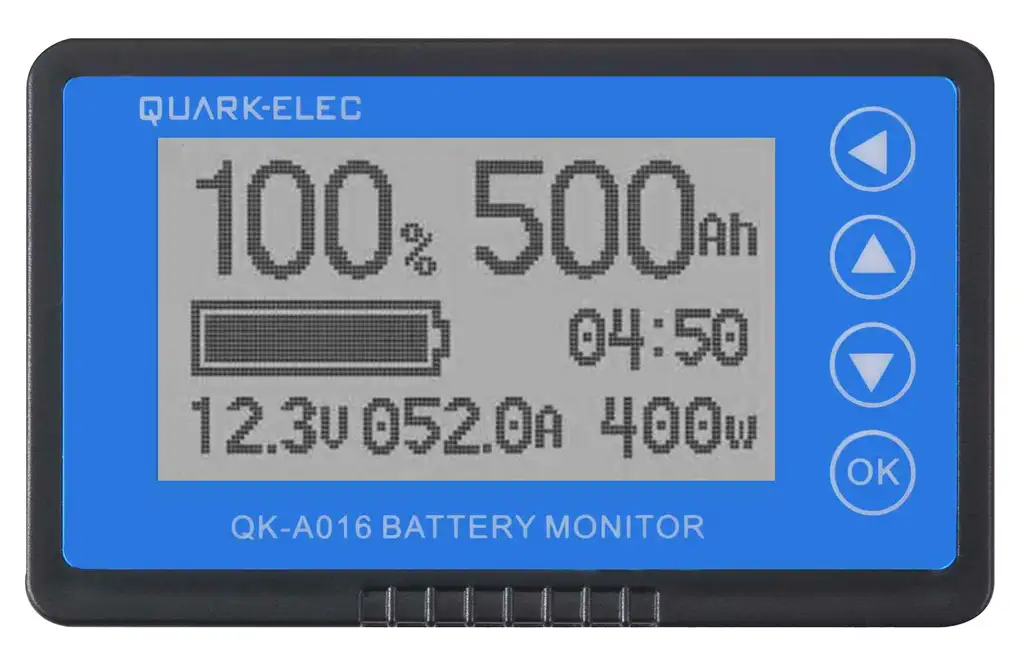 - Displays voltage, current, amp‑hours, SoC, and time remaining.